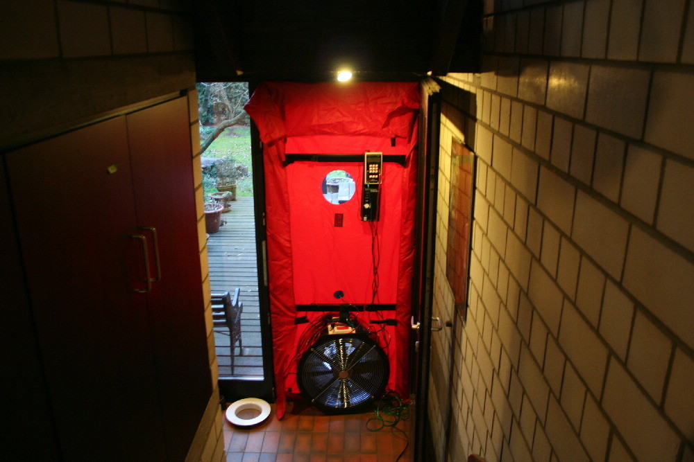 In dem Gebäude wird mit Hilfe des Blower-Door-Gerätes, das meist an der Außentür angebracht wird, ein Unter- bzw. Überdruck von 50 Pascal erzeugt und der Luftstrom, der durch die Gebäudehülle entweicht, gemessen. Nach der Energieeinsparverordnung (EnEV) darf der gemessene Wert bei Gebäuden ohne raumlufttechnische Anlagen 3,0 1/h und bei Gebäuden mit raumlufttechnischen Anlagen 1,5 1/h nicht überschreiten.